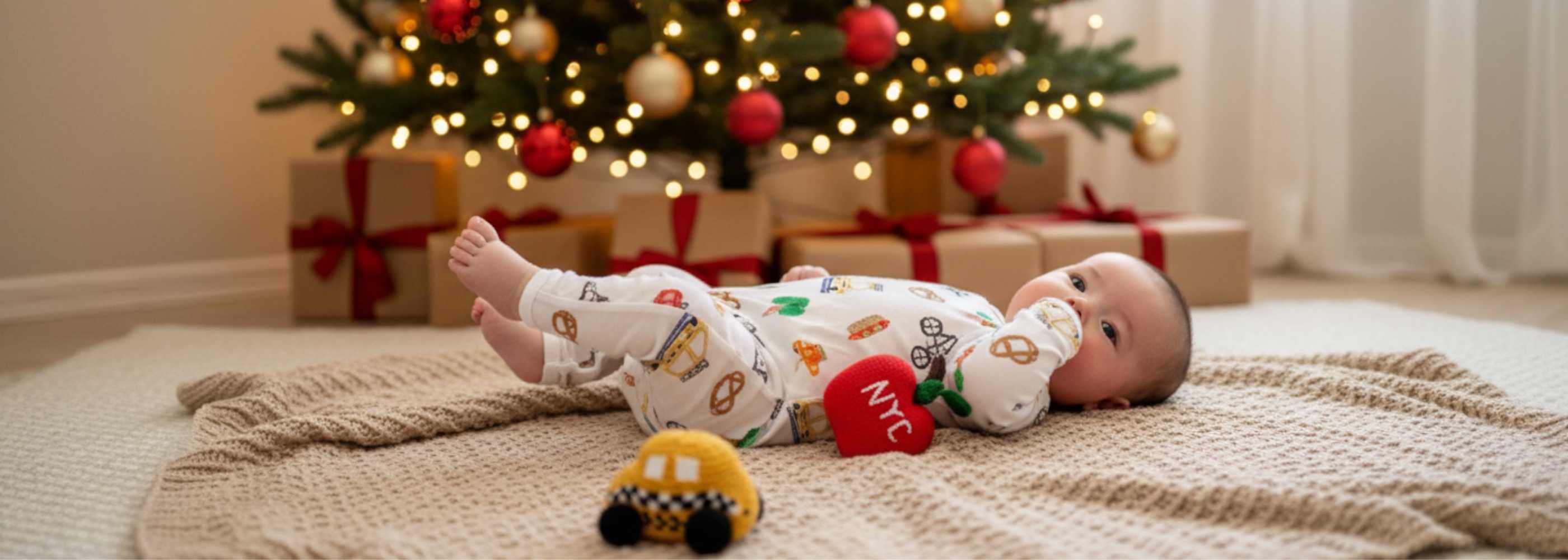 A stylish NYC welcome for baby. This set includes an I Love New York print onesie and the award-winning hand-knit taxi rattle, perfect for play, cuddles, and big city adventures. NY attitude not included!